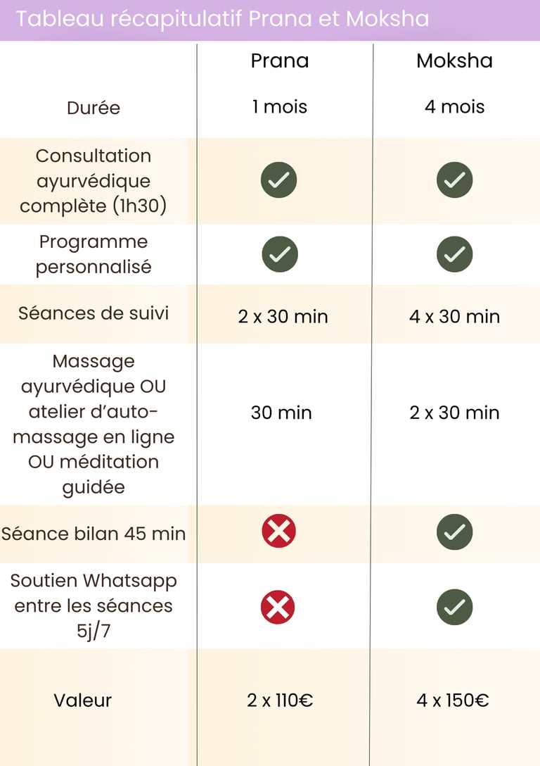 1 bilan ayurvédique complet (1h30): un temps d'écoute approfondi pour faire le lien entre votre anxiété, votre corps, votre alimentation et votre rythme de vie.